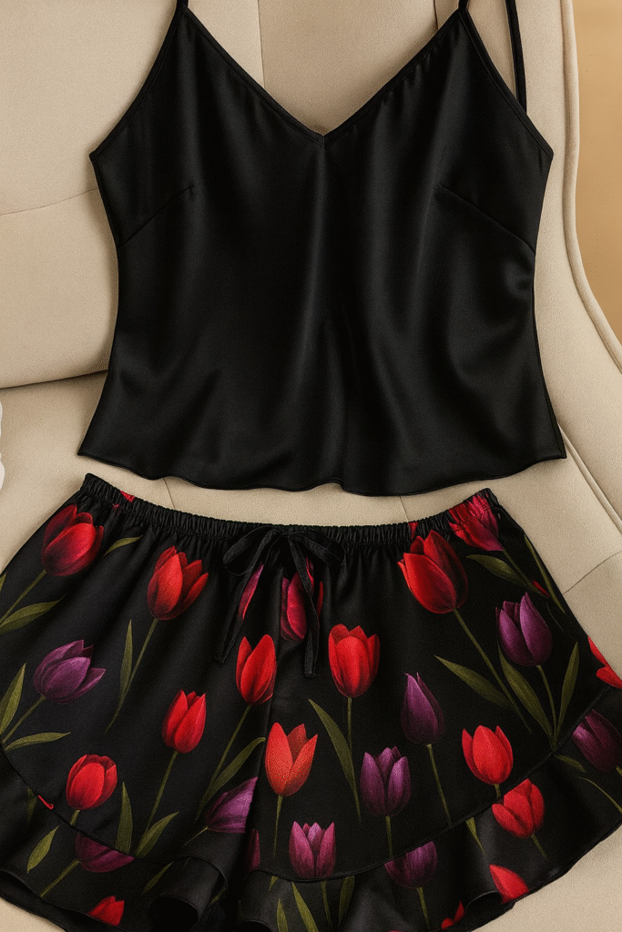 نصيحة: اختاري بيجامة حرير بلون عاجي أو وردي باهت، مع تطريز خفيف عند الأكمام لتمنحك إطلالة عروس هادئة وفاخرة.