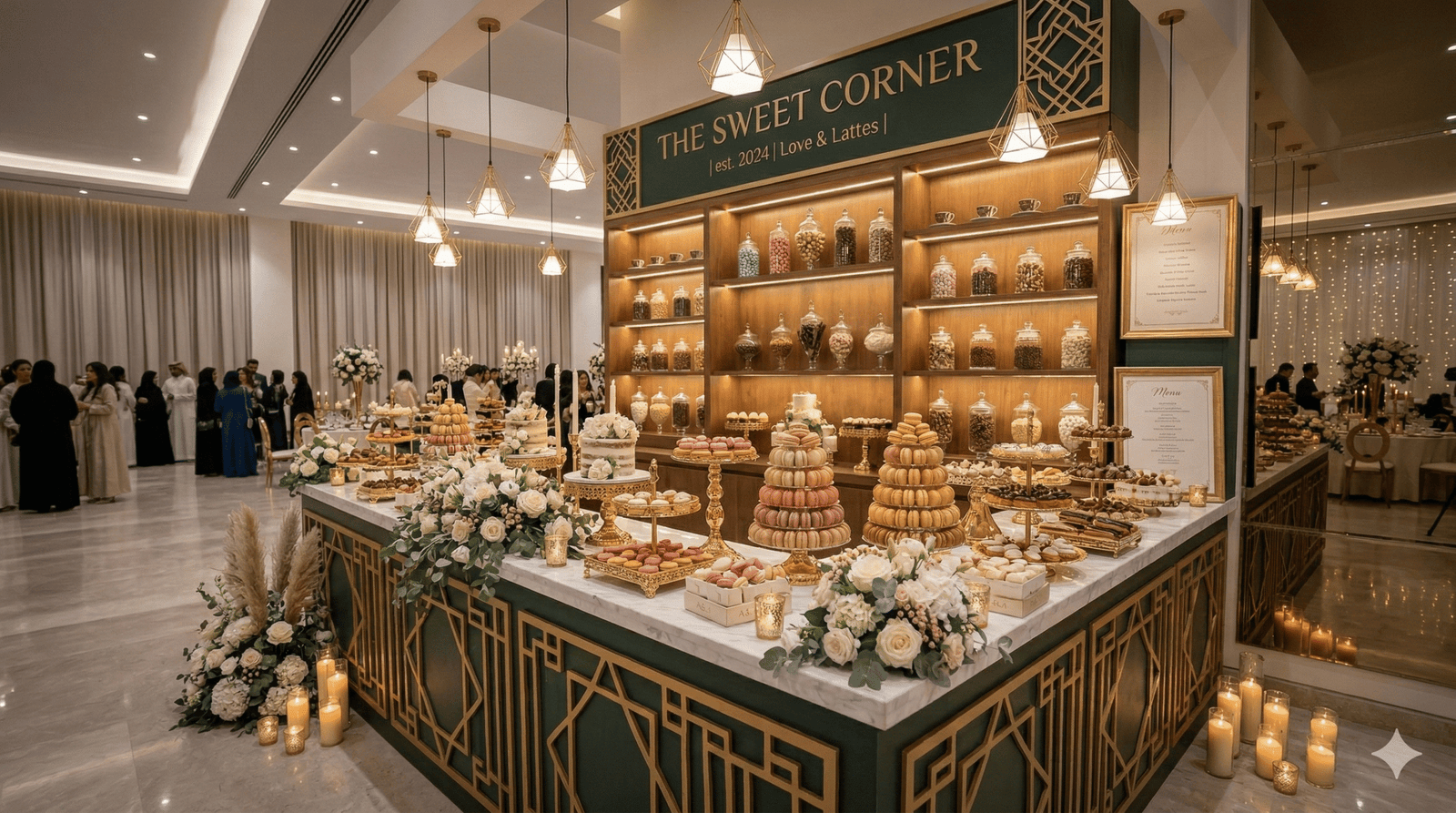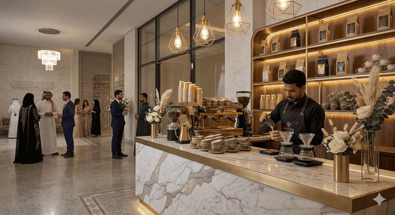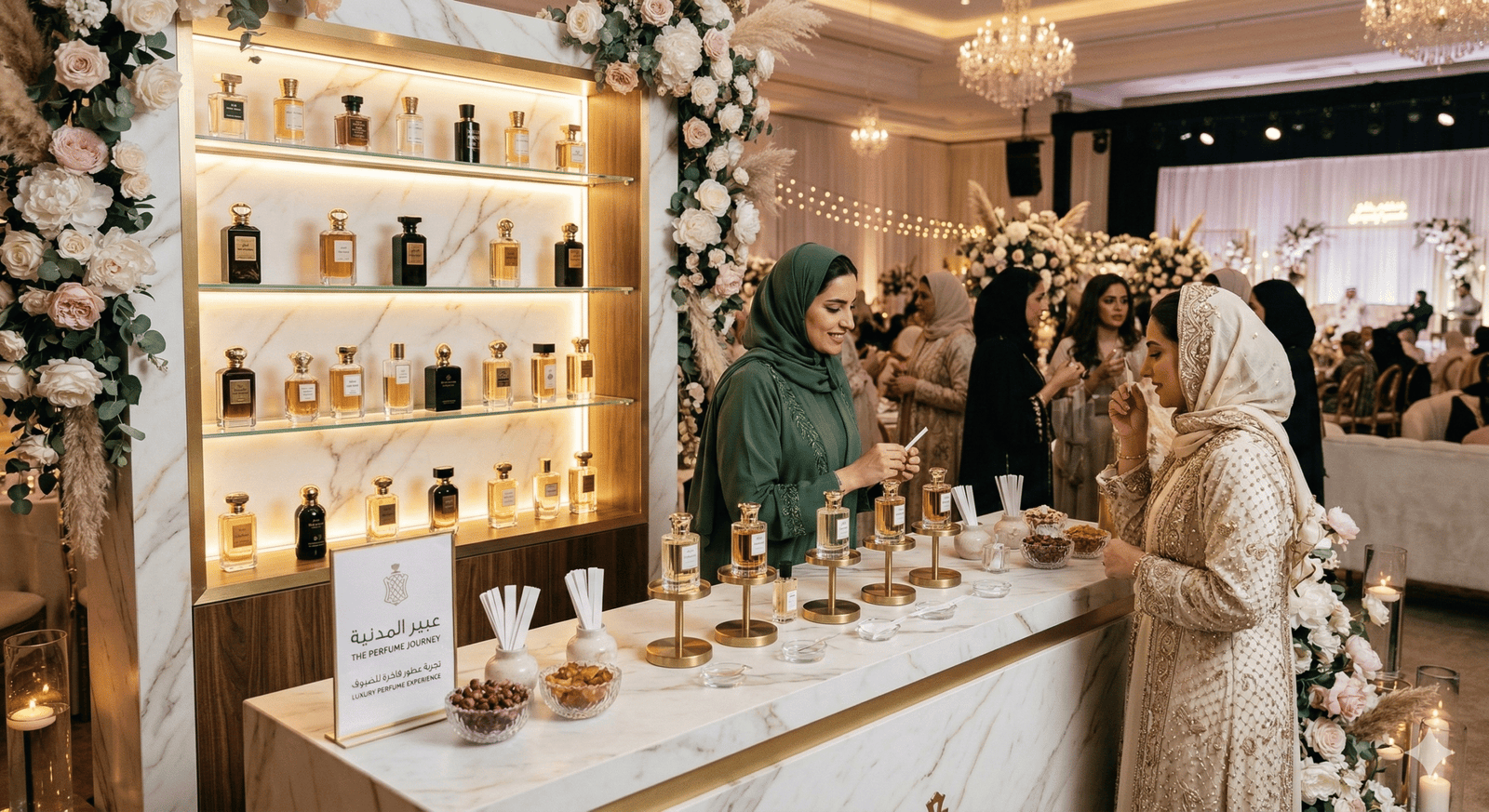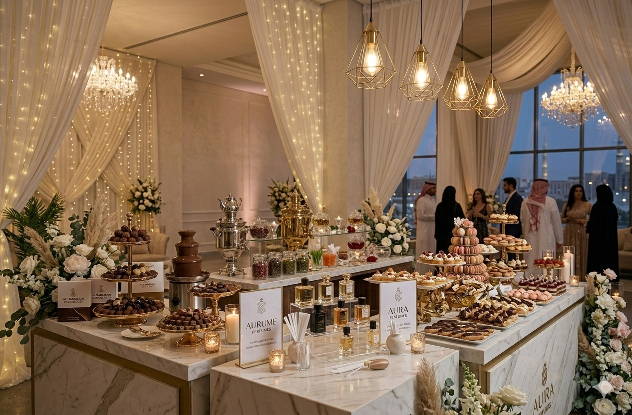 “في حفلات الزفاف الحديثة لم تعد القاعة مجرد مكان للاحتفال، بل تجربة كاملة يعيشها الضيوف بكل حواسهم. من كورنر العطور الذي يملأ المكان بروائح فاخرة، إلى ركن القهوة العربية والقهوة المختصة، وصولاً إلى زوايا الحلويات والشوكولاتة الأنيقة… كل تفصيلة صغيرة تضيف لمسة فخامة وتجعل الزفاف أكثر تميزاً في ذاكرة الحضور.”