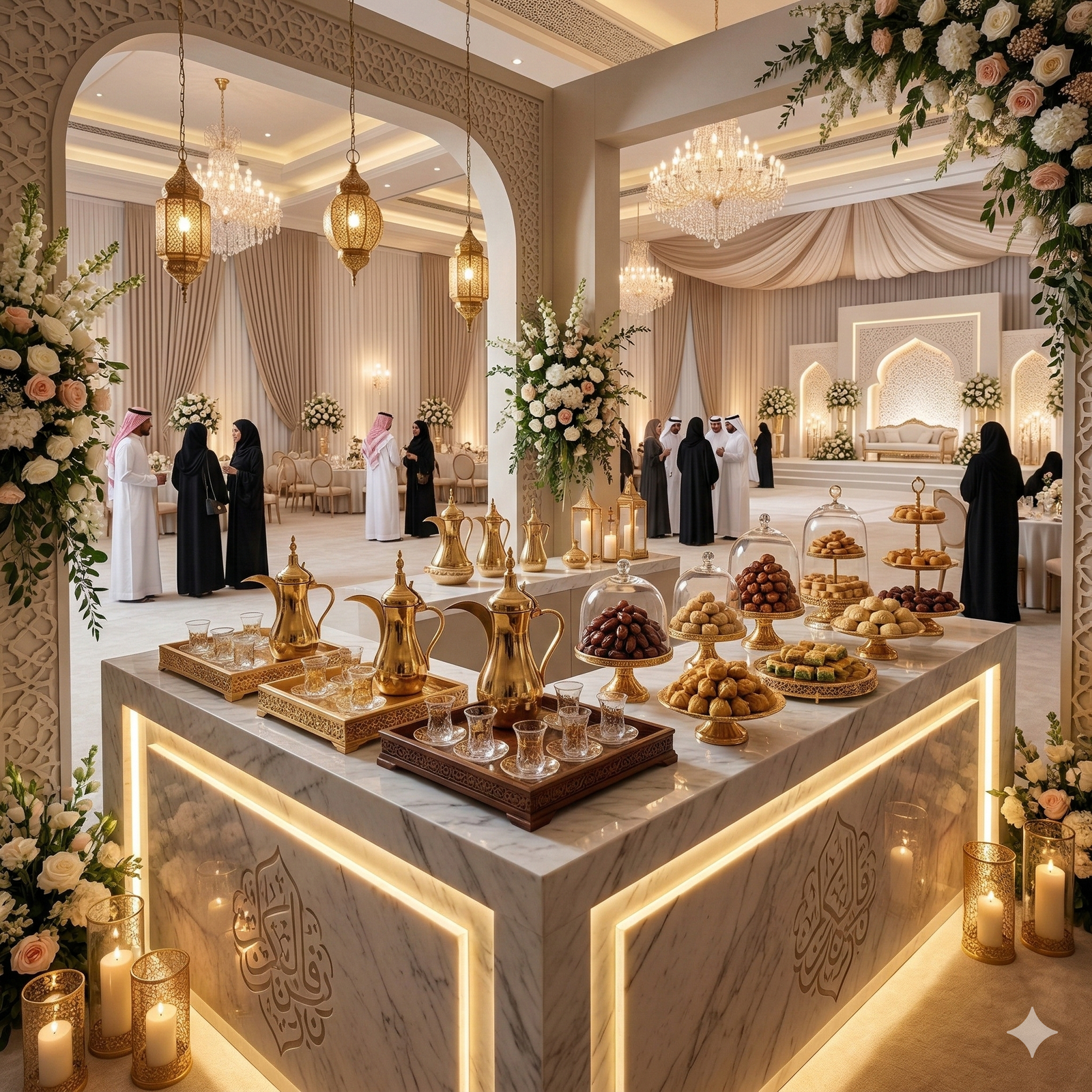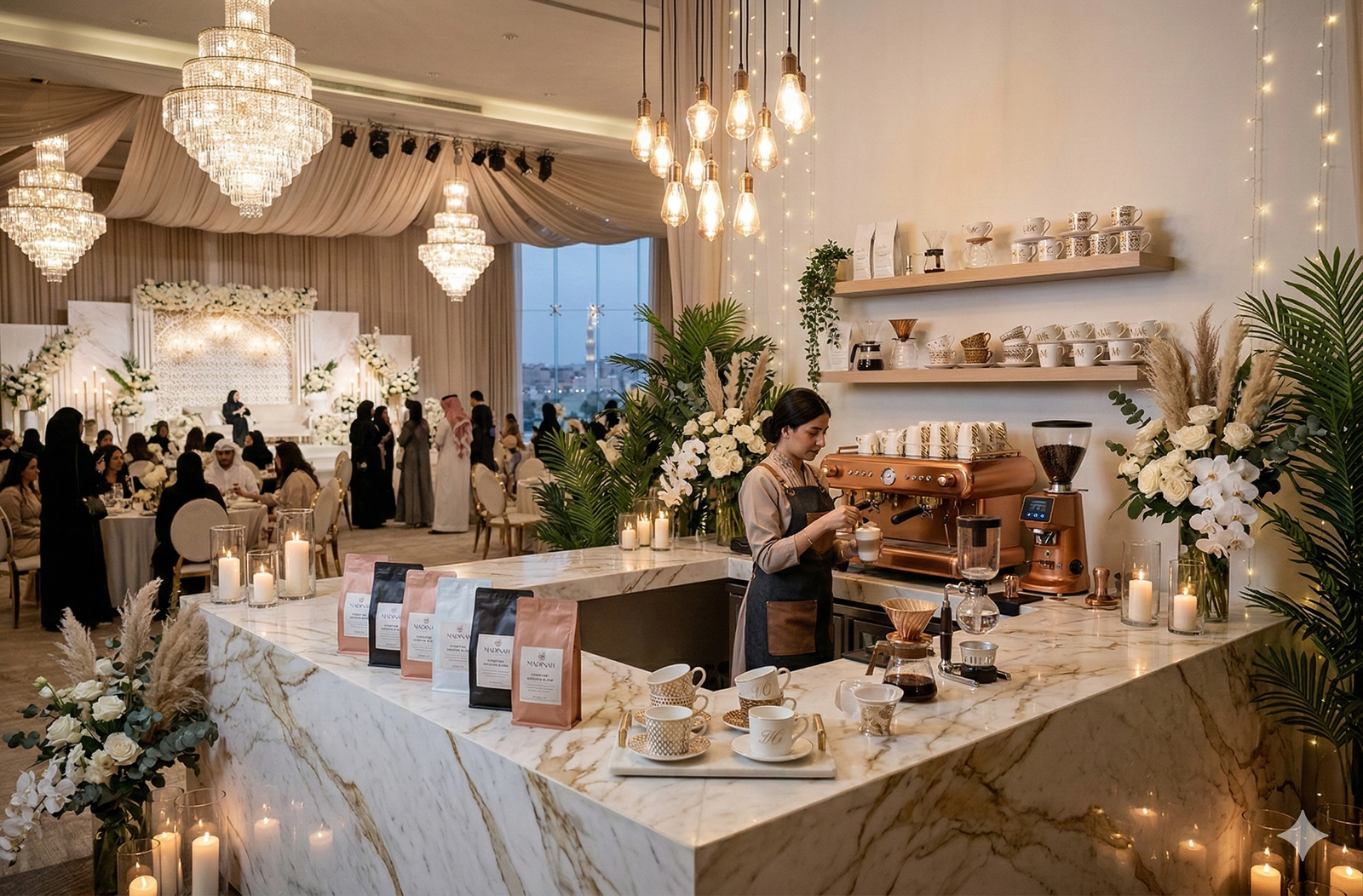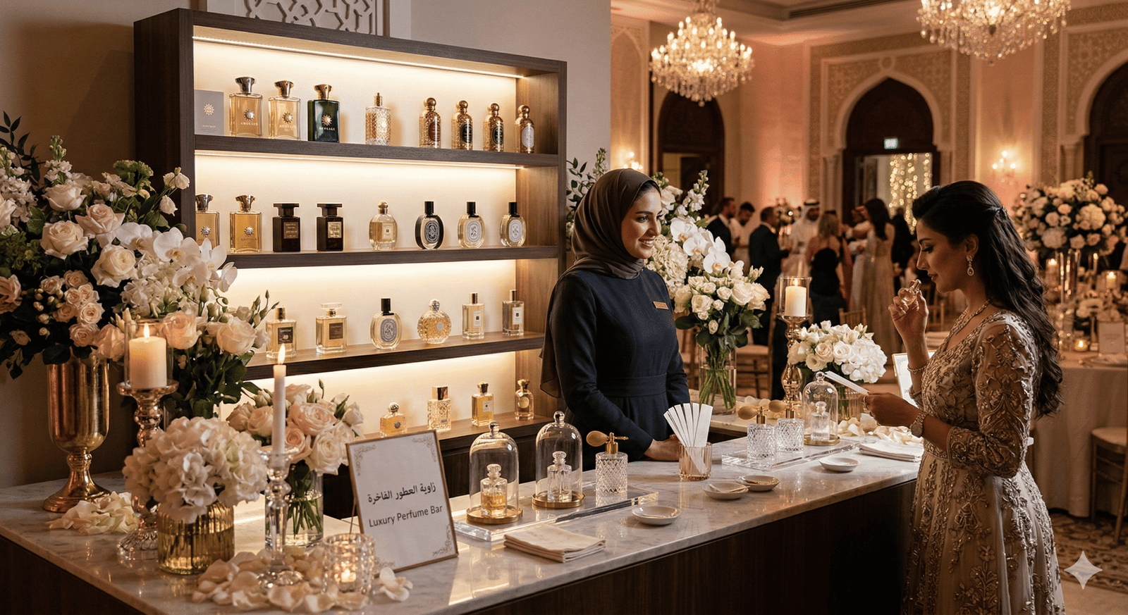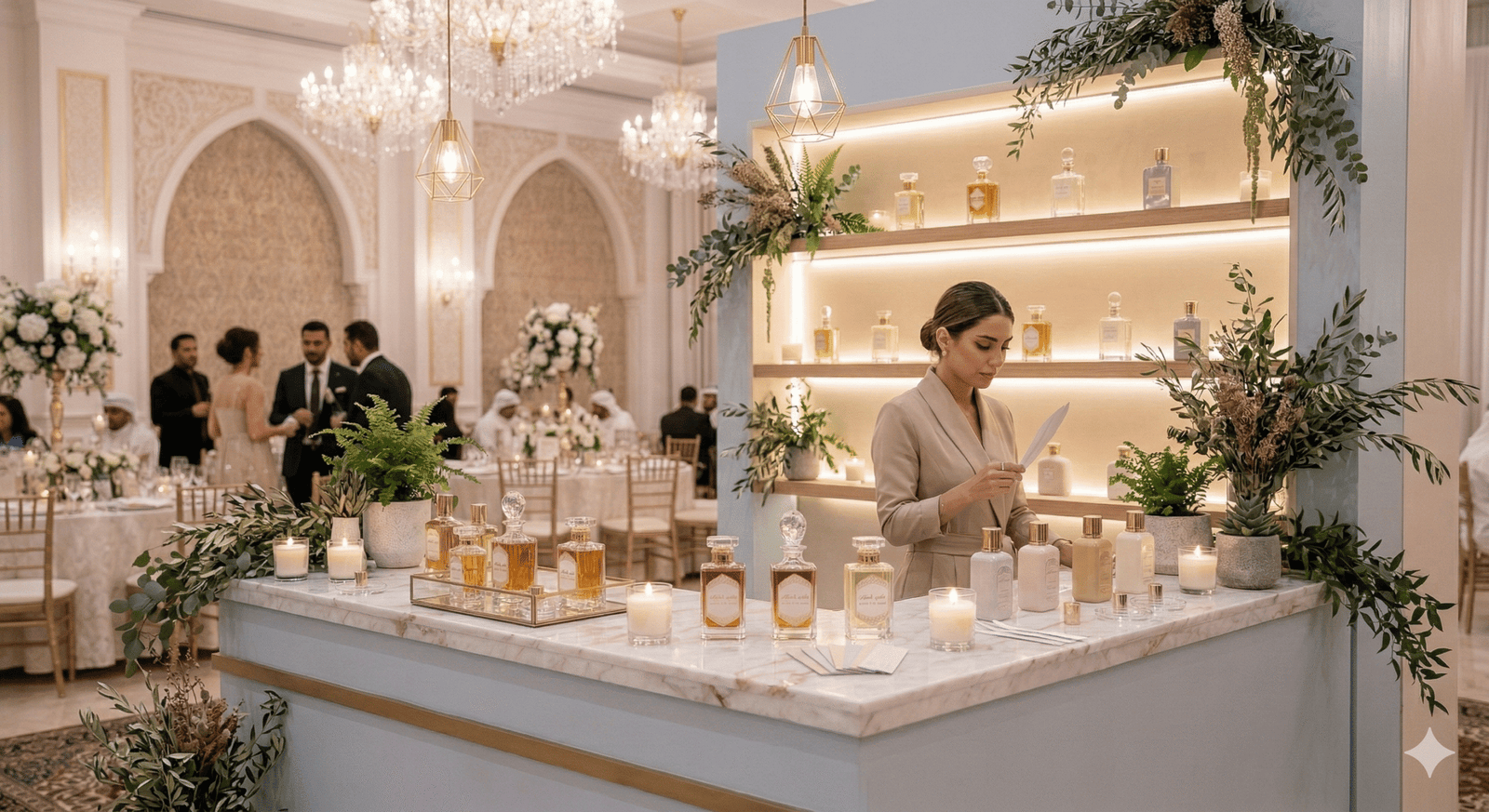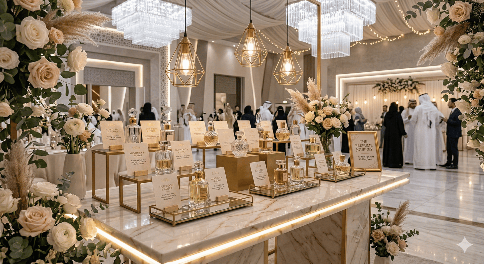 “في حفلات الزفاف الحديثة لم تعد القاعة مجرد مكان للاحتفال، بل تجربة كاملة يعيشها الضيوف بكل حواسهم. من كورنر العطور الذي يملأ المكان بروائح فاخرة، إلى ركن القهوة العربية والقهوة المختصة، وصولاً إلى زوايا الحلويات والشوكولاتة الأنيقة… كل تفصيلة صغيرة تضيف لمسة فخامة وتجعل الزفاف أكثر تميزاً في ذاكرة الحضور.”