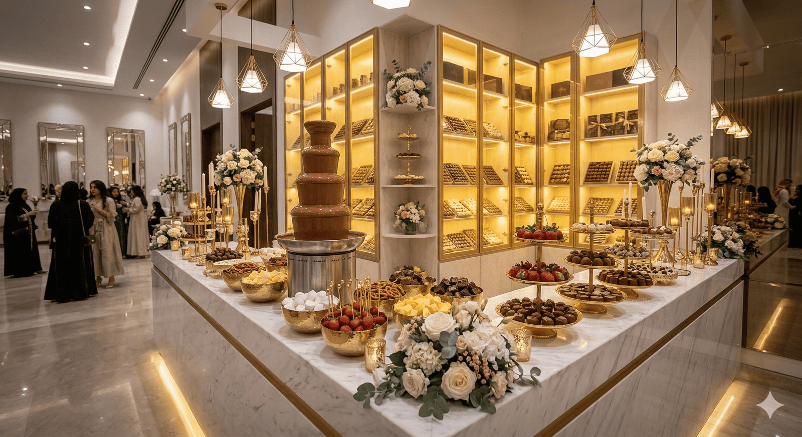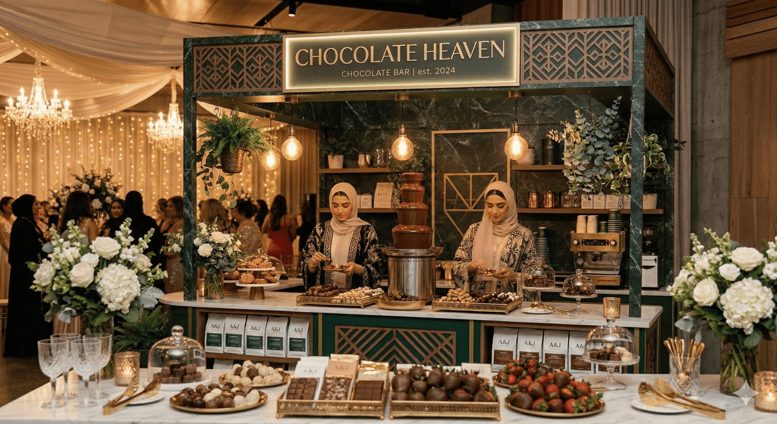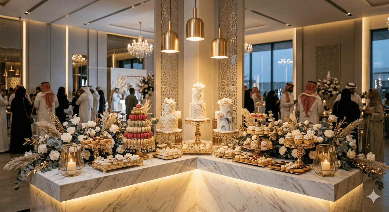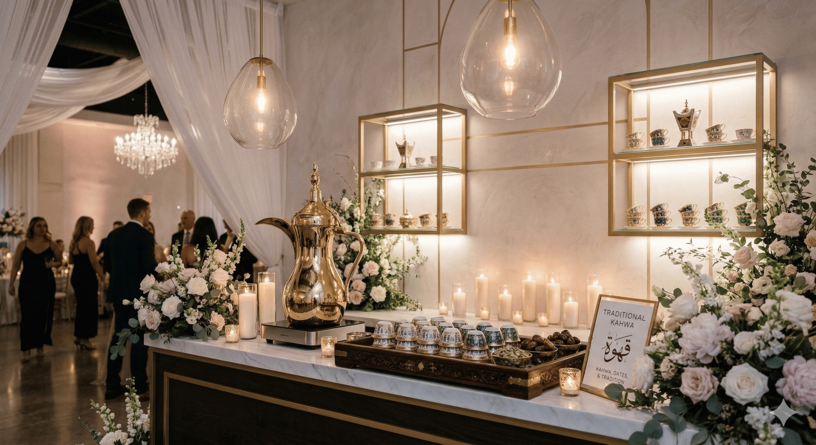 “في حفلات الزفاف الحديثة لم تعد القاعة مجرد مكان للاحتفال، بل تجربة كاملة يعيشها الضيوف بكل حواسهم. من كورنر العطور الذي يملأ المكان بروائح فاخرة، إلى ركن القهوة العربية والقهوة المختصة، وصولاً إلى زوايا الحلويات والشوكولاتة الأنيقة… كل تفصيلة صغيرة تضيف لمسة فخامة وتجعل الزفاف أكثر تميزاً في ذاكرة الحضور.”