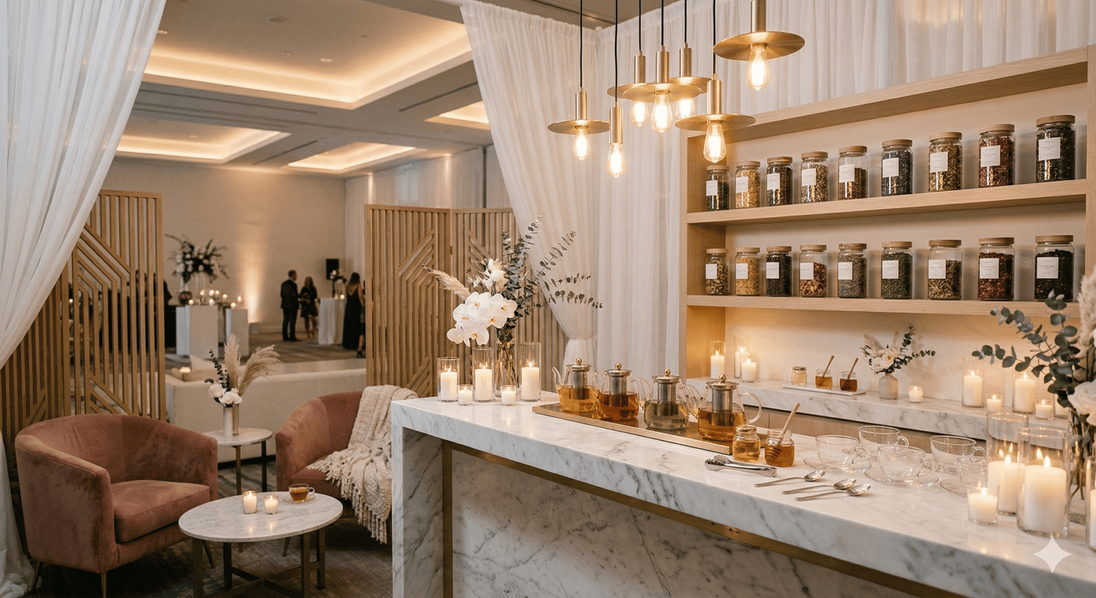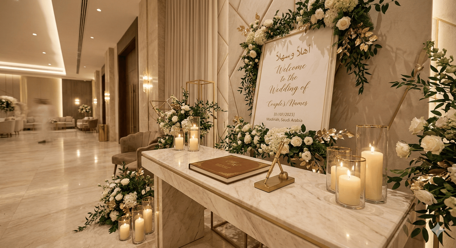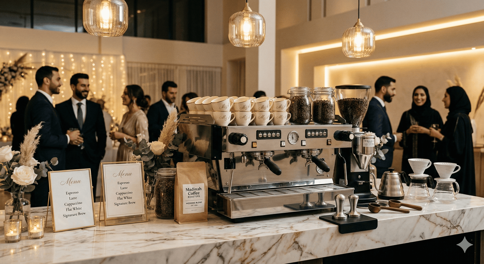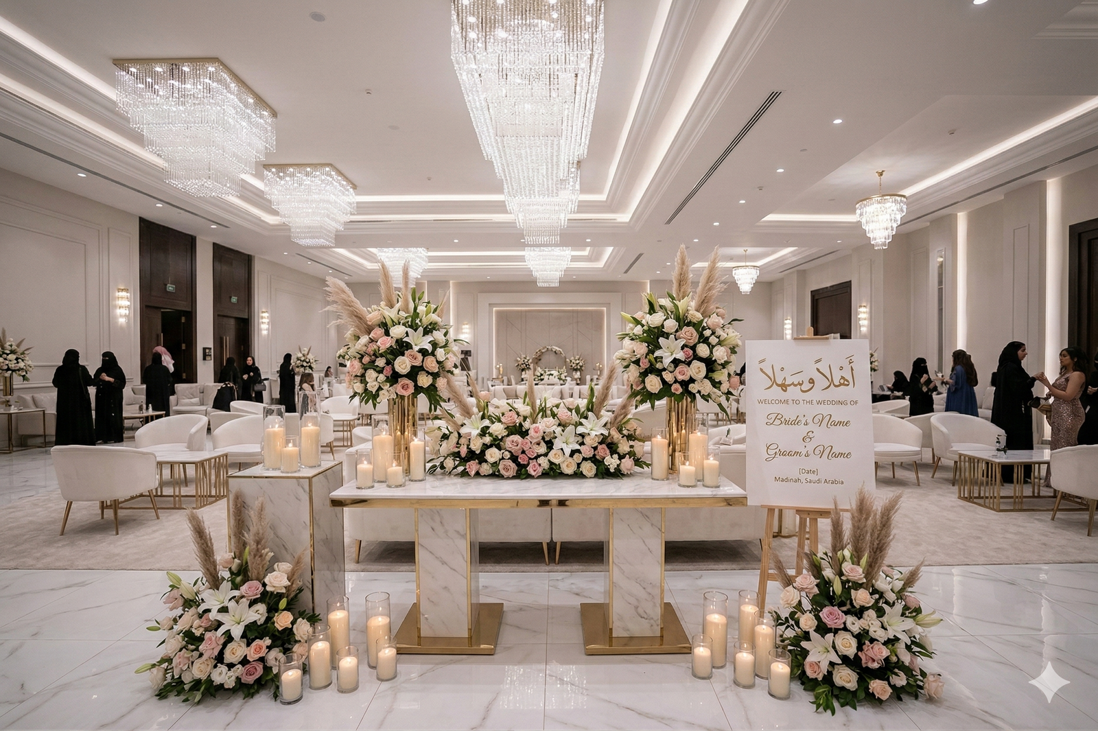 “في حفلات الزفاف الحديثة لم تعد القاعة مجرد مكان للاحتفال، بل تجربة كاملة يعيشها الضيوف بكل حواسهم. من كورنر العطور الذي يملأ المكان بروائح فاخرة، إلى ركن القهوة العربية والقهوة المختصة، وصولاً إلى زوايا الحلويات والشوكولاتة الأنيقة… كل تفصيلة صغيرة تضيف لمسة فخامة وتجعل الزفاف أكثر تميزاً في ذاكرة الحضور.”