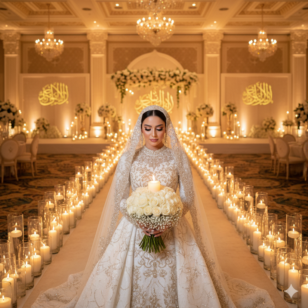 إضاءة ناعمة، ممر طويل مليان شموع، ورود بيضاء تمشي بينهم وهي كأنها من فيلم خيالي.