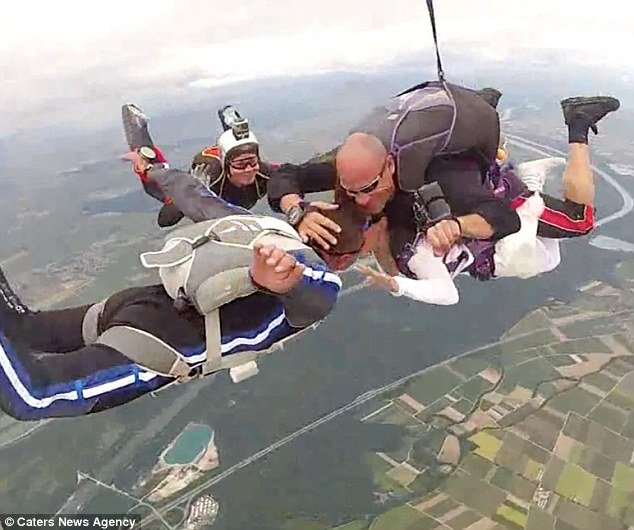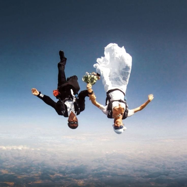 صعد العروسان مع مجموعة من الأصدقاء إلى الطائرة، وعندما وصلت إلى الارتفاع المطلوب قفز الجميع بالمظلات.