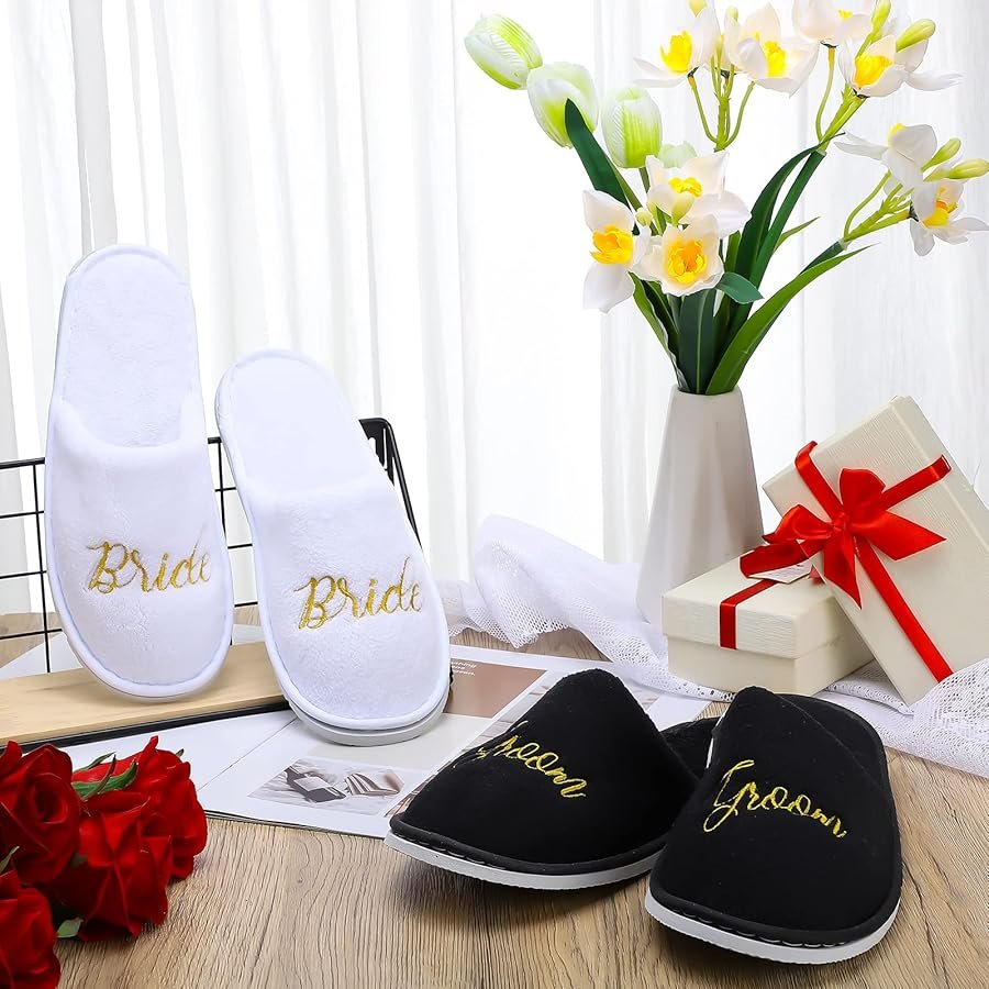 ارتدت العروس بيجاما حريرية بيضاء، بينما ارتدى العريس بيجاما كلاسيكية مخططة.