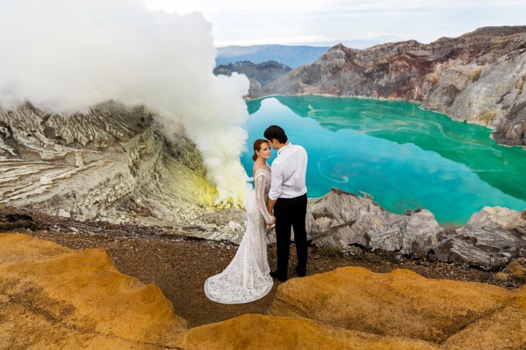 في إندونيسيا قرر زوجان محبان للمغامرة إقامة حفل زفافهما قرب فوهة بركان نشط.