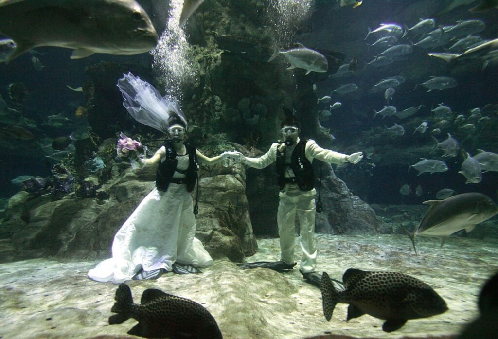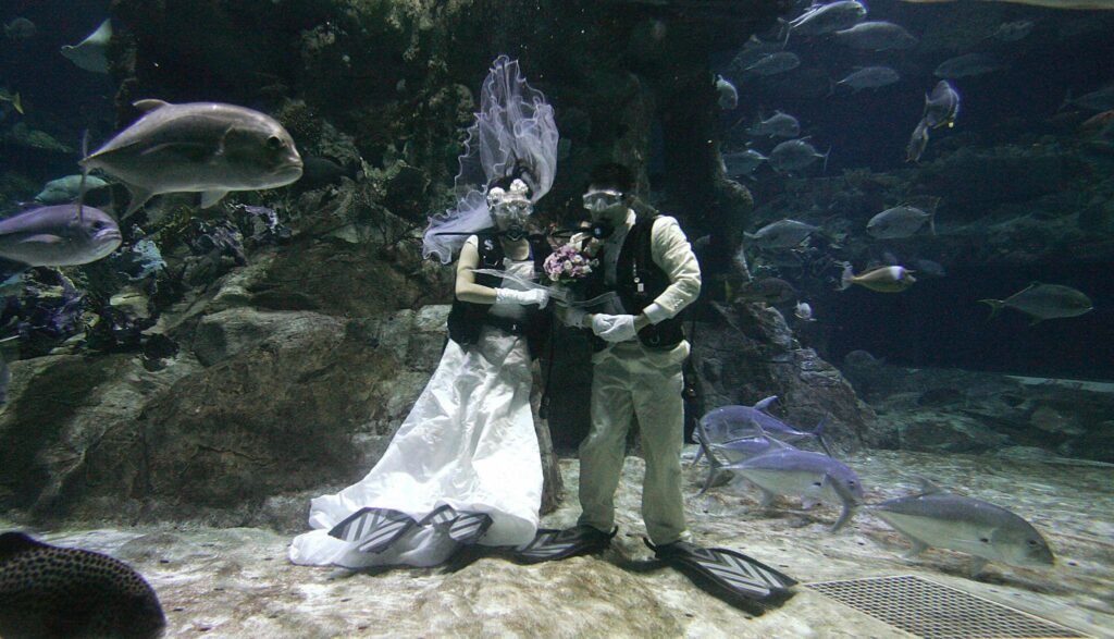 بدلاً من الموسيقى التقليدية، كان صوت فقاعات الهواء يملأ المكان، بينما الأسماك الملونة تمر بجانب العروسين.