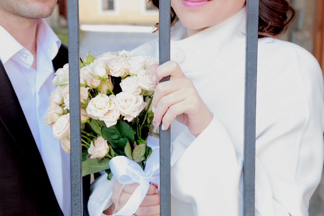 ارتدت العروس فستاناً أبيض بسيطاً، بينما ارتدى العريس ملابس السجن.